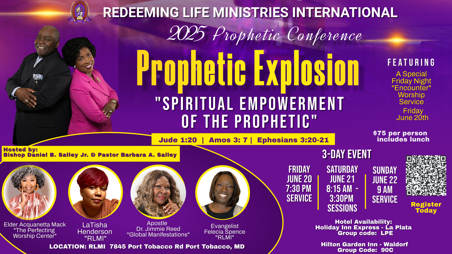 june, 2025 Redeeming Life Ministries International7845 Port Tobacco Road, Port Tobacco, Maryland 20677 20junAll Day222025 Prophetic Conference - "Prophetic Explosion"Guest Speaker: Apostle Dr. Jimmie Reed Event RegistrationRegister Time june 20 (Friday) - 22 (Sunday)(GMT-4:00) View in my time LocationRedeeming Life Ministries International7845 Port Tobacco Road, Port Tobacco, Maryland 20677 CalendarGoogleCal Comments are closed.